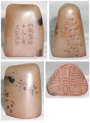 The stone is translucent with dark inclusions, a bit like moonstone. The short choppy strokes on the inscription make the characters hard to decipher. The 2nd line, which is the date, might be interpreted in many ways due to the Chinese cyclical calendar.